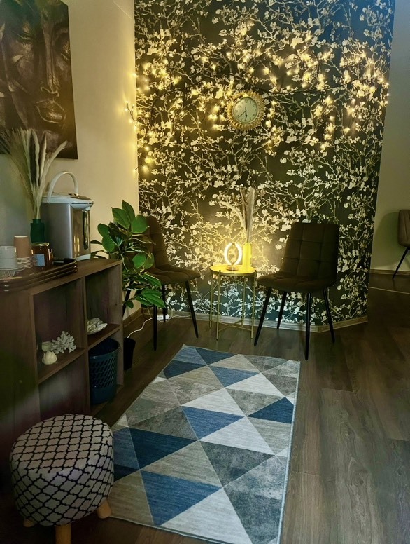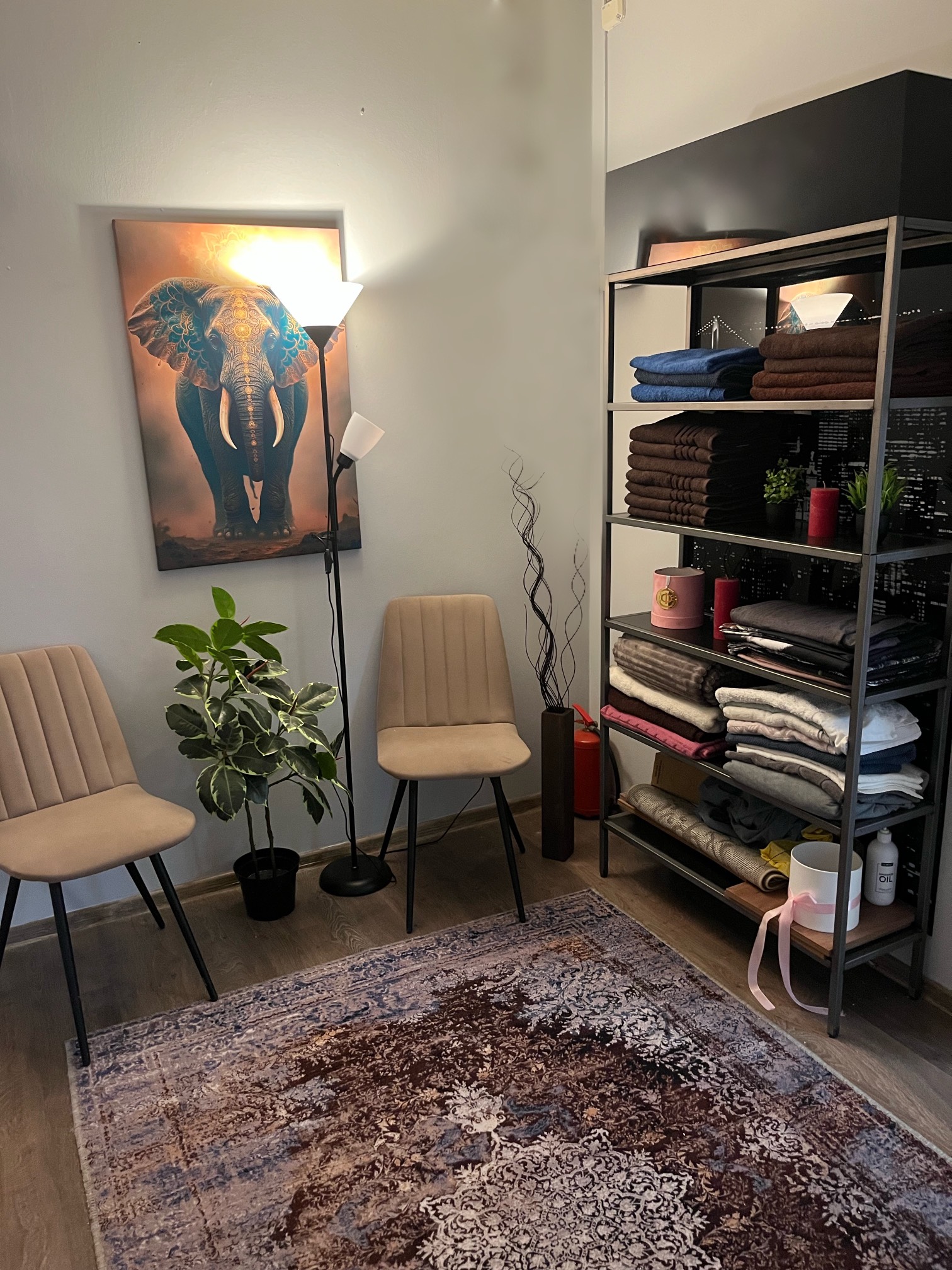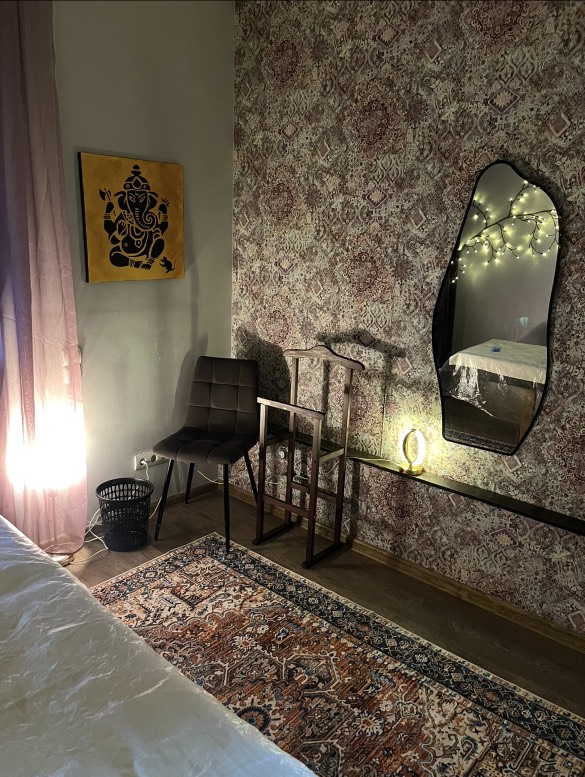 Во всех кабинетах уютный интерьер в стиле спа, есть светильники, вешалки для одежды, стулья клиентам и мастерам, ковры, в кабинетах тематические картины и интерьер, благовония по желанию.