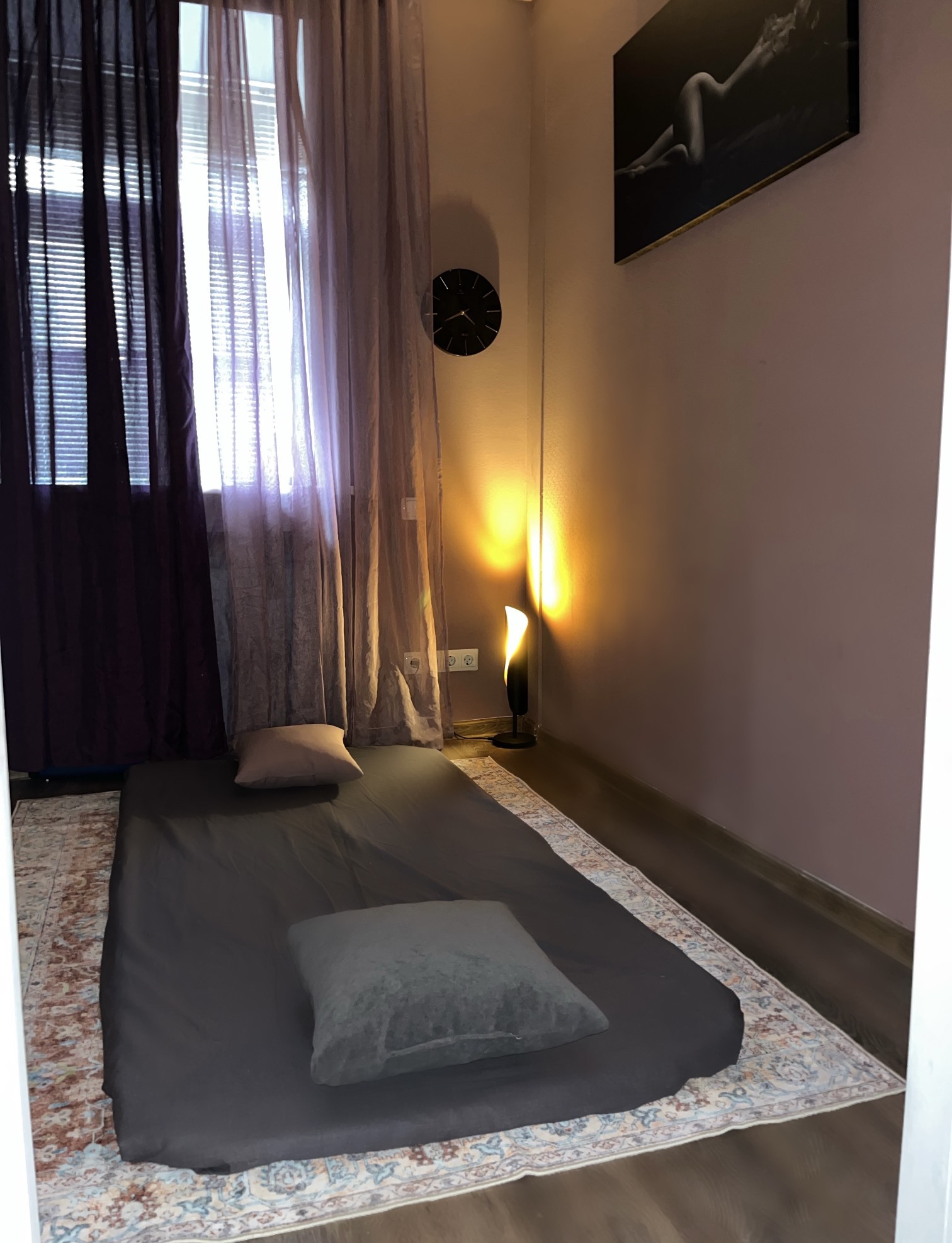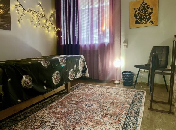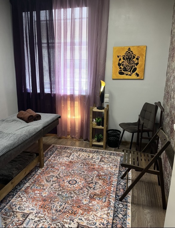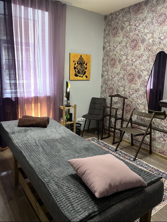 В кабинете: массажный стол, второй раскладной с регулировкой по высоте, стулья, светильники, колонка, вешалка, можно поставить два стола для двойных программ, а также мат. Доступ в душ.