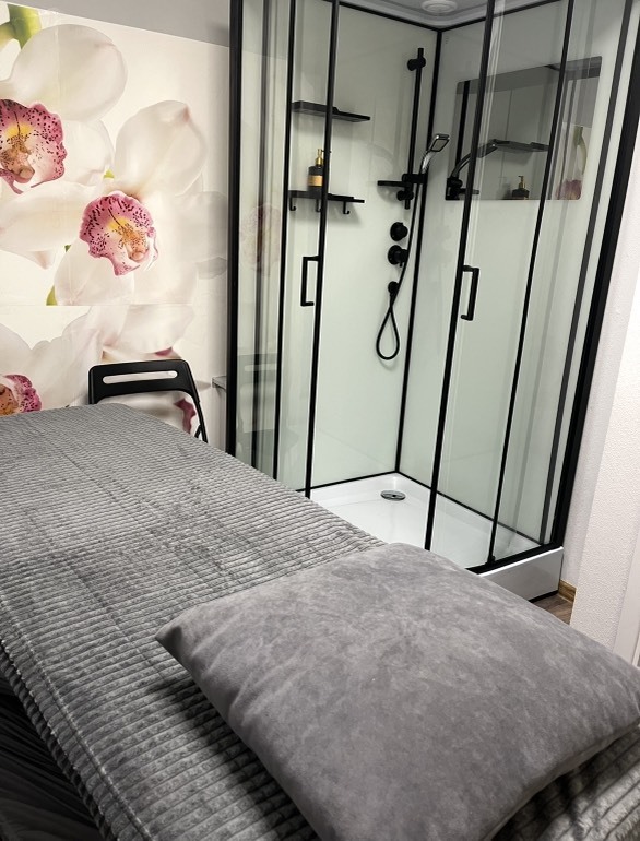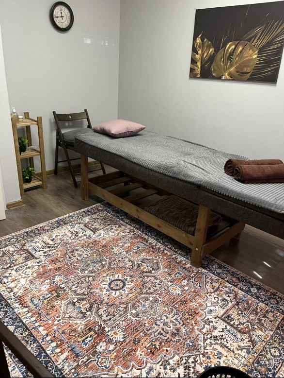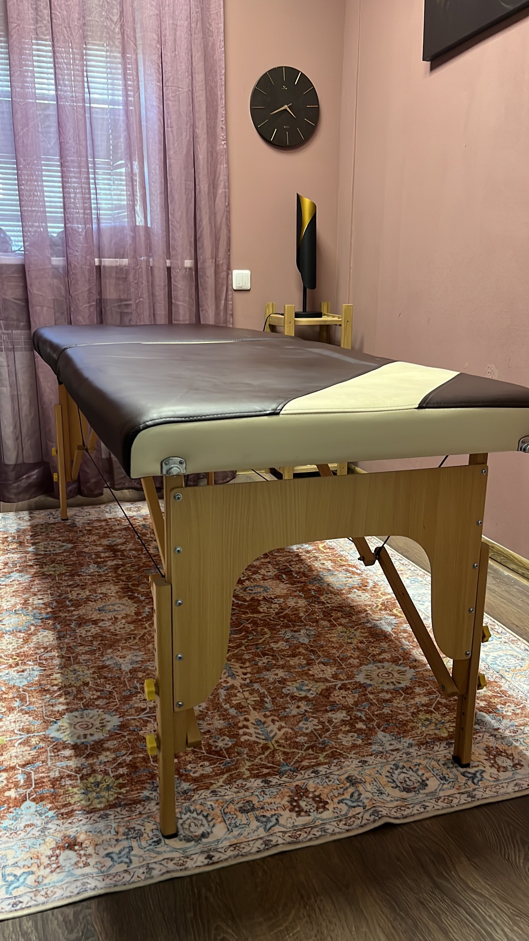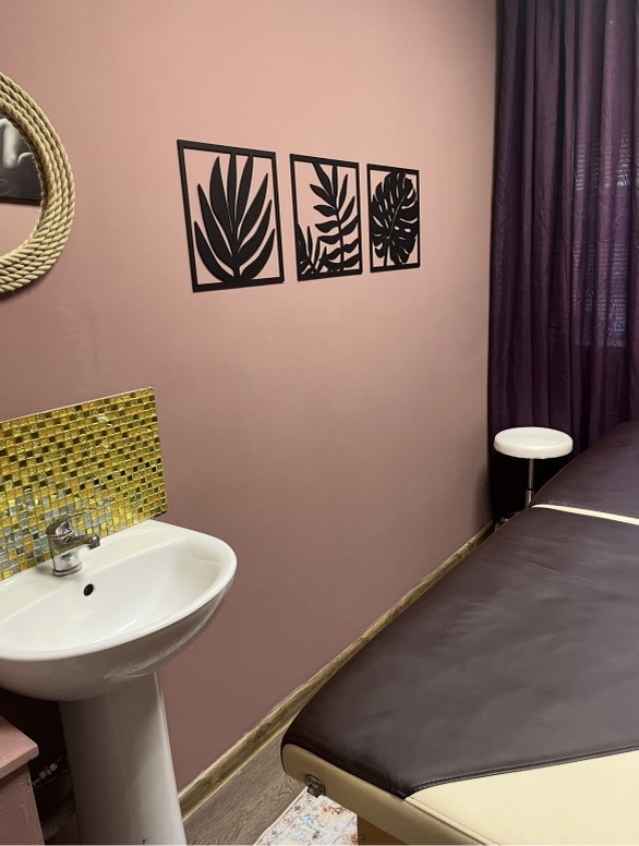 В кабинете: раковина, массажный стол с регулировкой по высоте, мат, колонка, светильники, вешалка. Доступ в душ.